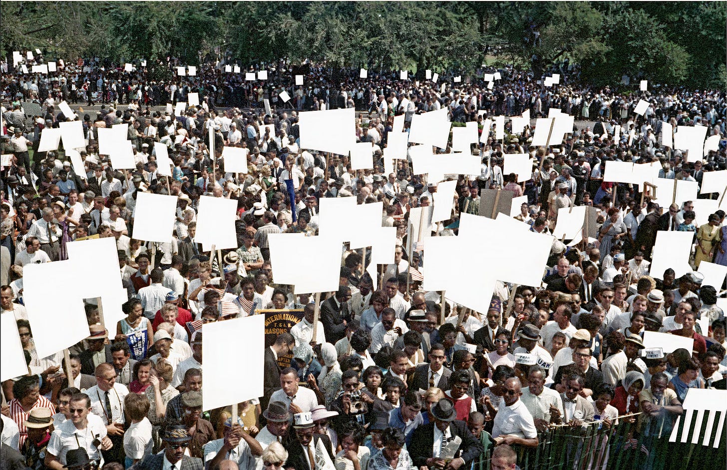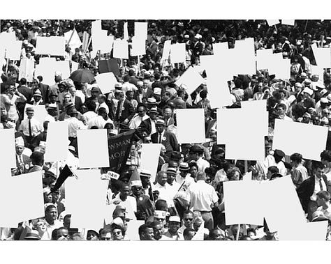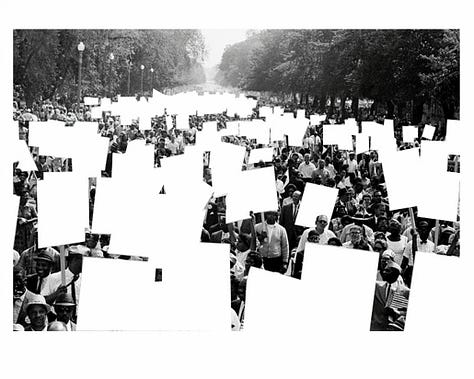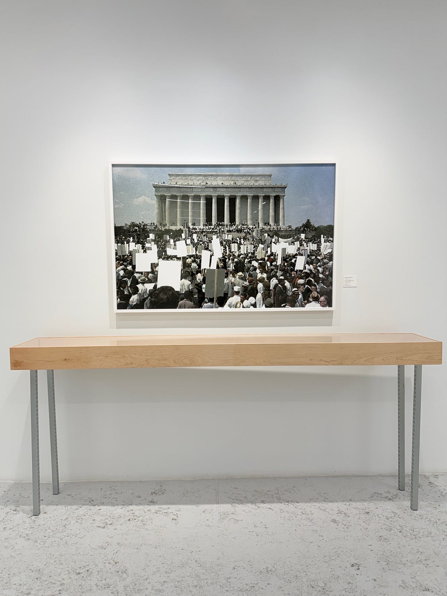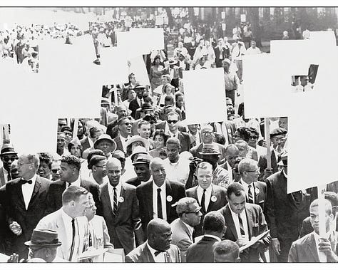 Hands grip sticks; faces show urgency, fatigue, resolve. But the usual words are missing. What’s left is visual tension—a gap between what we see and what we think we know. In my series Forgotten Struggle, begun in 2011, I remove text from civil rights picket signs, leaving them blank. At first, something seems missing, but soon that absence changes. The signs stop communicating and start interrupting. They block, hide, and flatten the meaning. They don’t instruct you.